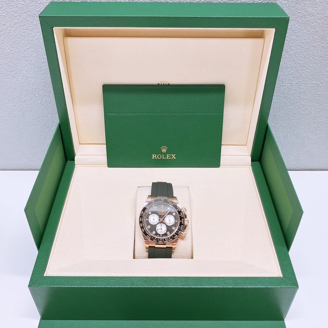 まず外観の大きな特徴は、ケース素材にロレックス独自のピンクゴールド合金「エバーローズゴールド」が使われている点です。一般的なゴールドよりも赤みがあり、落ち着いた上品な色味が魅力です。また、ベゼル(外周部分)にはブラックのセラミック素材が採用されており、傷に強く、長期間使っても色あせにくいという実用面でのメリットがあります。このゴールドとブラックの組み合わせが、華やかさと引き締まった印象を両立させています。