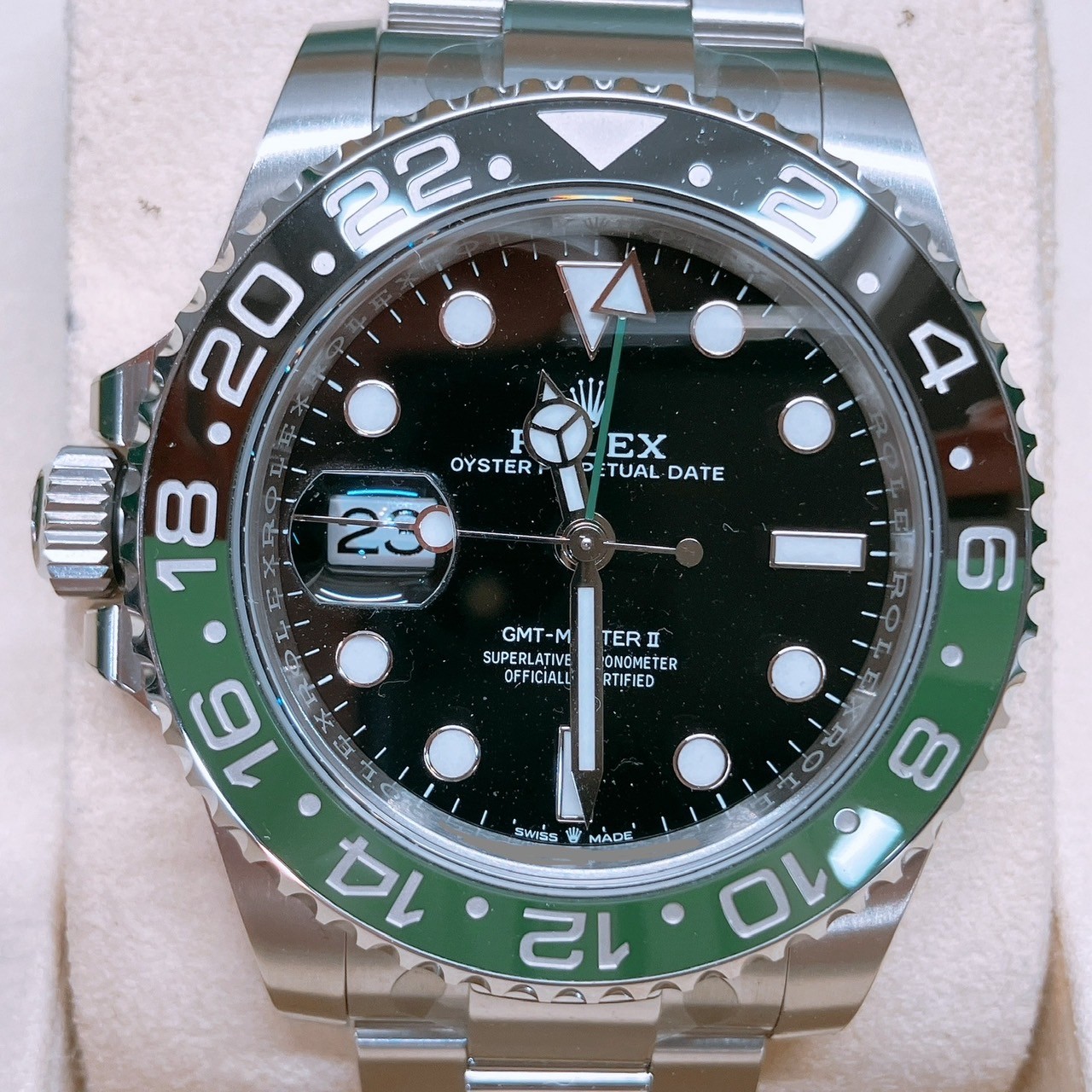 - <div>ご覧いただきありがとうございます。</div><div>おたからや小倉守恒店の植波です。</div><div>今回は福岡県北九州市小倉南区のお客様よりロレックス GMTマスターⅡ 126720VTNRを買取させていただきました。</div><div>ありがとうございます!</div><div><br></div><div>世界初のセカンドタイムゾーンを表示する腕時計として開発されたGMTマスター。複数地点の時間を表示できる画期的な機能を備えたデュアルタイムウォッチとして世界的に人気のモデルです。 <br></div><div>GMTマスターは、1955年に誕生。異なる時間帯を移動する国際線パイロットの要望を元に、パン・アメリカン航空と共同開発されました。24時間表記の回転ベゼルとGMT針(24時間針)で、複数地点の時間を簡単に知ることができます。 <br></div><div>過去には、「GMTマスター(I)」と「GMTマスターII」の2タイプが存在。GMTマスター(I)は回転ベゼルとGMT針で2カ所の時間が表示できる仕様でしたが、1982年発表のGMTマスターIIで、時針(短針)が単独で動かせるようになり、3カ所の時間を把握できるようになりました。1999年頃まで、GMTマスターIとGMTマスターIIは併売されていましたが、現在はGMTマスターIIのみのラインナップとなっています。 <br></div><div>2022年に、青×黒ベゼルや赤×青ベゼルに次ぐ3機種目の新世代ステンレスモデルとして誕生した緑×黒ベゼルのRef.126720VTNR。回転ベゼルの色分けで、GMT針の指す時刻の昼夜が一目で識別可能で、さらに時針(短針)を独立して操作できる機構を備えることで、3カ所の時間を把握することができます。 <br></div><div>リューズが左側にありますが、従来の右リューズGMTマスターIIと機能や操作は同様で、ムーブメントも同じく新世代と呼ばれる3200系の「Cal.3285」を搭載します。</div><div>ちなみにこのモデルは、左利き用(レフトハンド、レフティー)と表現されがちですが、左リューズである理由や用途について、ロレックスの公式コメントはなく、その意図は謎となっています。 <br></div><div><br></div><div>以上、GMTマスターⅡ 126720VTNRについてご紹介させていただきました。</div><div><br></div><div><div>おたからや小倉守恒店では、ロレックスなどの高級時計はもちろん、貴金属・ブランド品・商品券・古銭・古美術品・骨董品・切手・家電製品など多種多様に買取を行っております。</div><div>新品保管品は勿論、長年ご愛用されたお品物でも勿論査定させていただきますので、お買い物やランチなどのついでにお気軽にお立ち寄り下さい。</div><div>スタッフ一同心より皆様のご来店お待ちしております。</div> <br></div>
